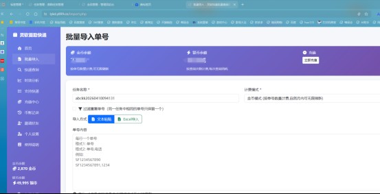 2. 批量添加单号:支持手动粘贴、文档导入两种方式,粘贴圆通单号时,需确保单号之间用逗号或换行分隔,导入后手动选择“圆通快递”(避免自动识别出错);